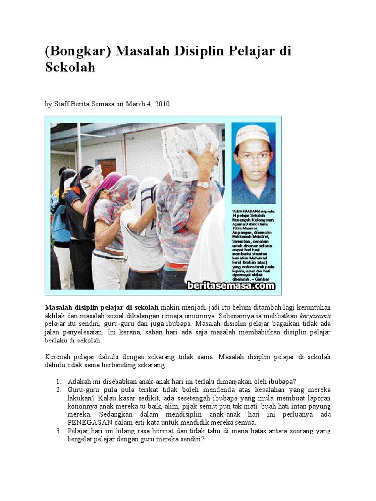 Berita-berita seperti kes buli kes pukul kes ponteng dan mengganggotai kumpulan gangster atau samseng menjadi wadah utama di dada-dada akhbar tempatan sejak akhir-akhir ini. 10 pelajar ditamatkan pengajian - KP Mara Mesyuarat JDM telah mengkaji kes tersebut dengan teliti dan mengambil keputusan menamatkan pengajian pelajar. Masalah disiplin di sekolah bukanlah perkara baru.